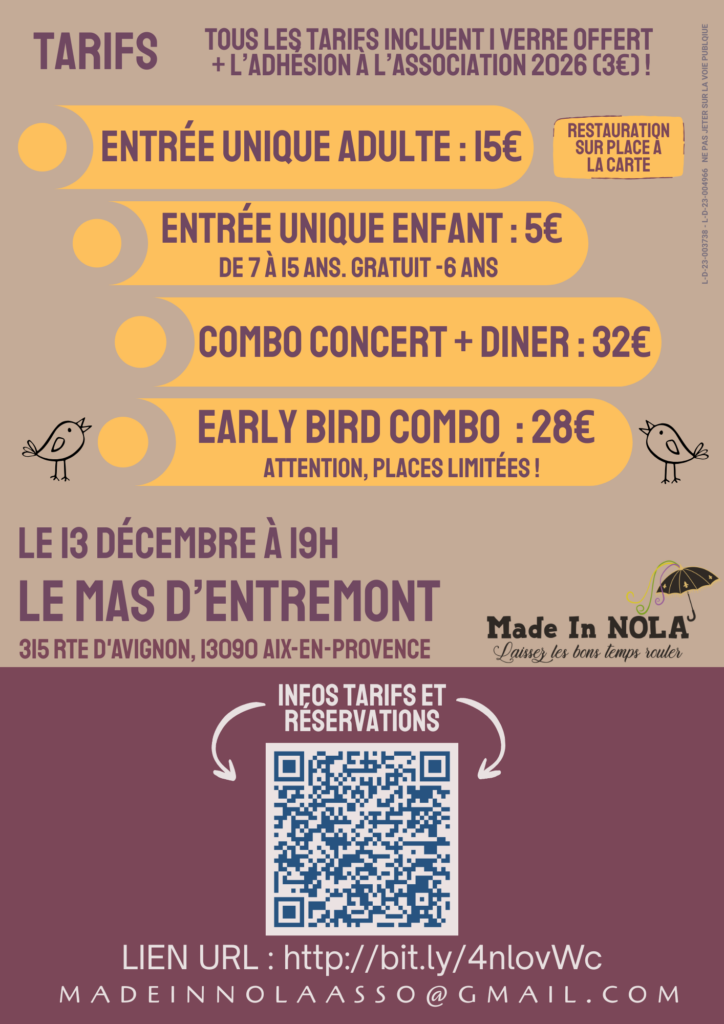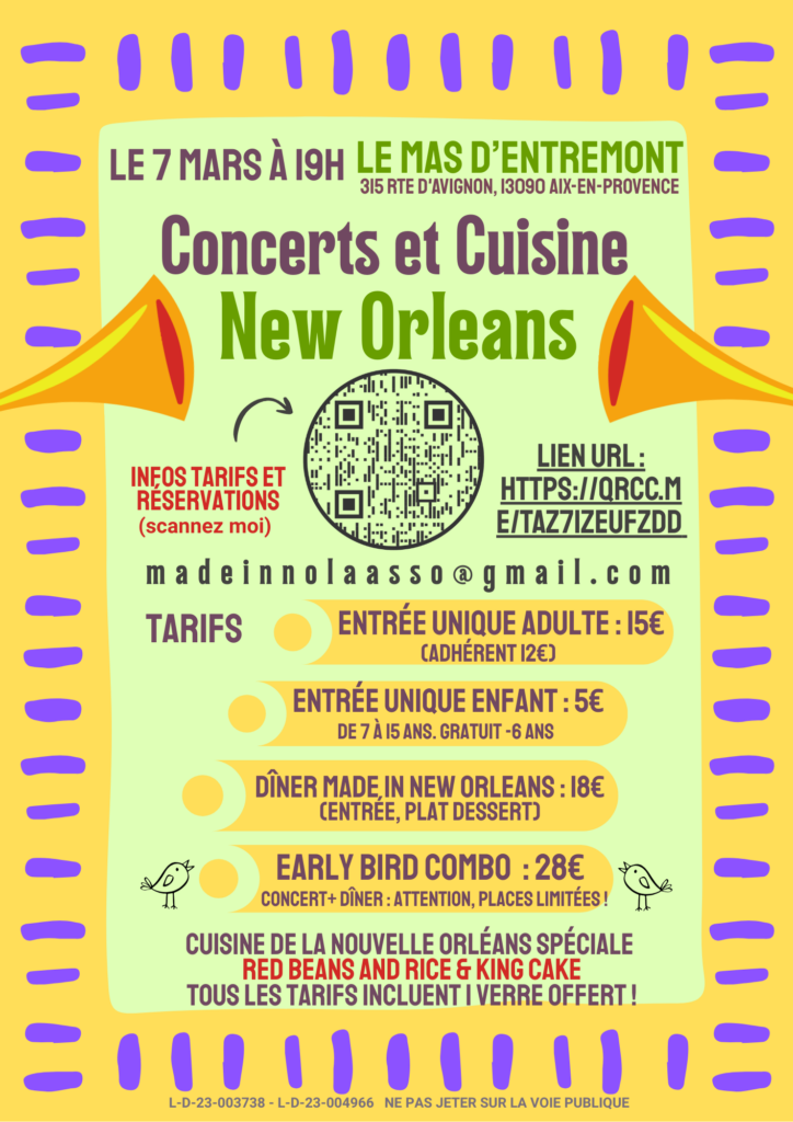 Quelques dimanches durant l’année, Made in NOLA vous invite à un événement culturel où la musique, la fête et la bonne cuisine se rencontrent pour un moment de partage et de convivialité dans une ambiance chaleureuse, festive et familiale. Ces rendez vous sont désormais des temps forts de la programmation culturelle de l’association. Au fil des années, une belle communauté s’est formée autour de nos événements : familiale, musicale, intergénérationnelle et internationale. Stay tuned pour l’annonce des prochaines dates !